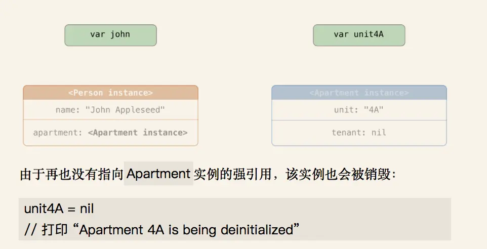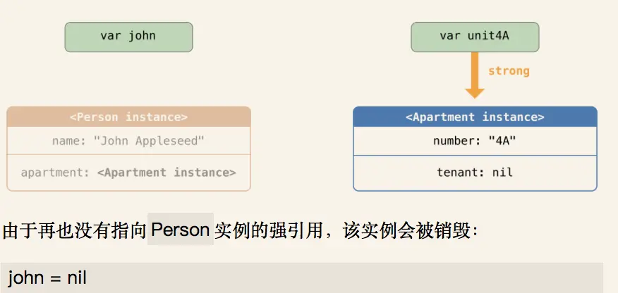 ARC初始化var reference1: Person? var reference2: Person? var reference3: Person? reference1 = Person(name: "John Appleseed") reference2 = reference1 reference3 = reference1 reference1 = nil reference2 = nil // 此时person对象还没有释放, reference3 = nil // 执行之后,对象进行释放,打印deinit 方法 // 打印 “John Appleseed is being deinitialized