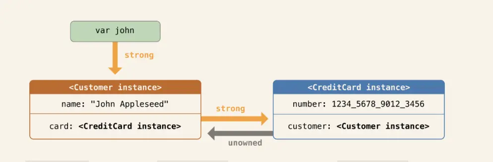 - Customer和CreditCard的例子展示了一个属性的值允许为nil,而另一个属性的值不允许为nil,这也可能会产生循环强引用。这种场景最适合通过无主引用来解决。