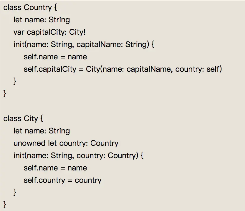 - Country的构造函数调用了City的构造函数。然而,只有Country的实例完全初始化后,Country的构造函数才能把self传给City的构造函数