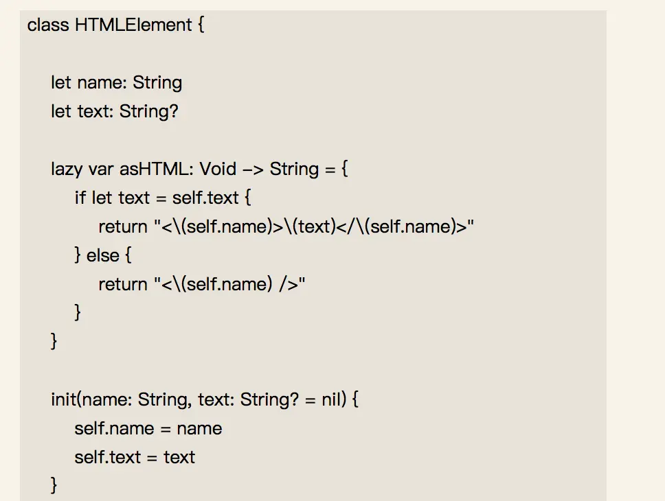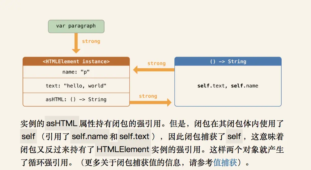 (如delegate = self.delegate!)。这些项在方括号中用逗号分开lazy var someClosure: (Int, String) -> String = { [unowned self, weak property= self. property!] (index: Int, stringToProcess: String) -> String in // 这里是闭包的函数体 }