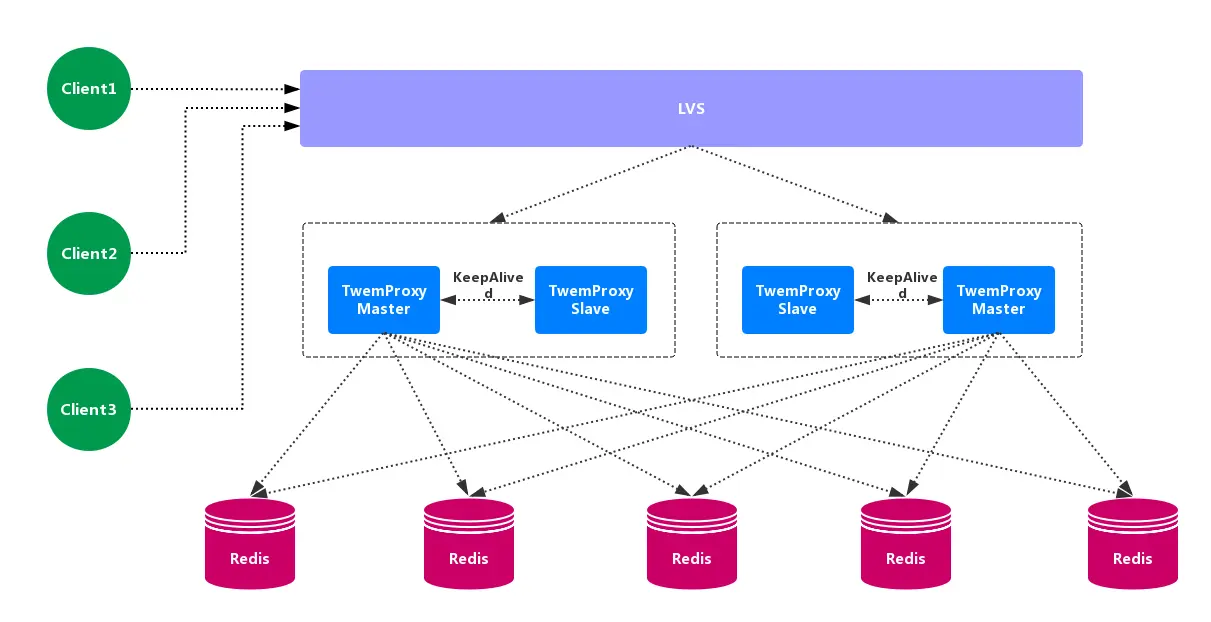 Twemproxy 也叫 nutcraker,是 twitter 开源的一个 redis 和 memcache 的 中间代理服务器 程序。Twemproxy 作为 代理,可接受来自多个程序的访问,按照 路由规则,转发给后台的各个 Redis 服务器,再原路返回。Twemproxy 存在 单点故障 问题,需要结合 Lvs 和 Keepalived 做 高可用方案。