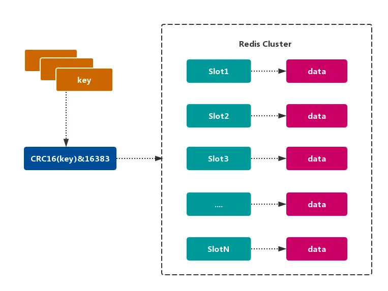 Redis Cluster 采用 虚拟槽分区,所有的 键 根据 哈希函数 映射到 0~16383 整数槽内,计算公式:slot = CRC16(key)& 16383。每个节点负责维护一部分槽以及槽所映射的 键值数据,如图所示: