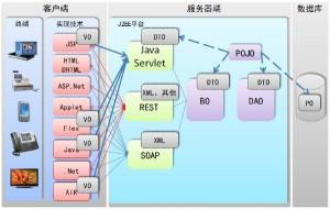 服务器端采用J2EE,客户端采用JSP、Flex、JavaFX、AIR等可以直接调用Servlet,其他的实现技术基本上不能直接调用,但是无论是那种客户端,对于基于SOAP的Web服务或者基于RESTful Web服务务都是支持的,如AJAX的 XMLHttpRequest、Flex的HTTPService等。如下图所示: