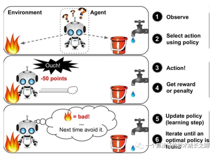 强化学习和上述三种学习问题是非常不同的。学习系统在这里被称为智能体( agent),可以对环境进行观察,选择和执行动作,获得奖励(负奖励是惩罚,见下图)。然后它必须自己学习哪个是最佳方法(称为 策略,policy),以得到长久的最大奖励。策略决定了智能体在给定情况下应该采取的行动 。