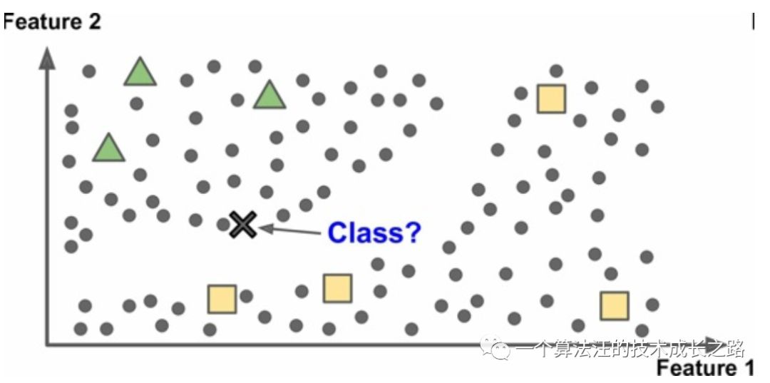 一些算法可以处理部分带标签的训练数据,通常是大量不带标签数据加上小部分带标签数据。这称作半监督学习。如下图所示,图中灰色圆点表示没有标签的数据,仅有几个三角形和正方形点表示带标签的数据。