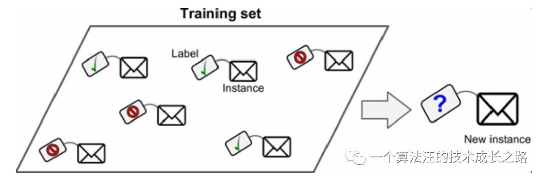 分类问题主要就是预测新数据的类别问题。例如上文提到的垃圾邮件过滤器就是一个二分类问题,将邮件分为垃圾邮件还是正常的邮件,如下图所示。