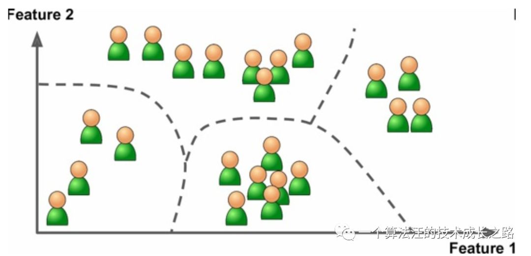 聚类就是将数据根据一定的规则分成多个类,通常是采用相似性。比如对于博客访客的聚类,通过聚类算法,检测相似性访客的分组,如下图所示。不需要告诉算法访客是哪个类别,它会自动根据访客的属性找到相互间的关系,比如它可能找出访客的职业关系,将访客分为有 40% 的是上班族,有 50% 的是学生,或者对于技术博客,可能就是根据开发方向,划分为前端、后台、移动开发、人工智能等等。甚至,如果采用层次聚类分析算法,还可以继续对上述的分类进行更加详细的划分。这种做法可以帮助博主知道自己博客的主要群体是谁,更好规划自己博客发表的文章应该以什么方向为主。