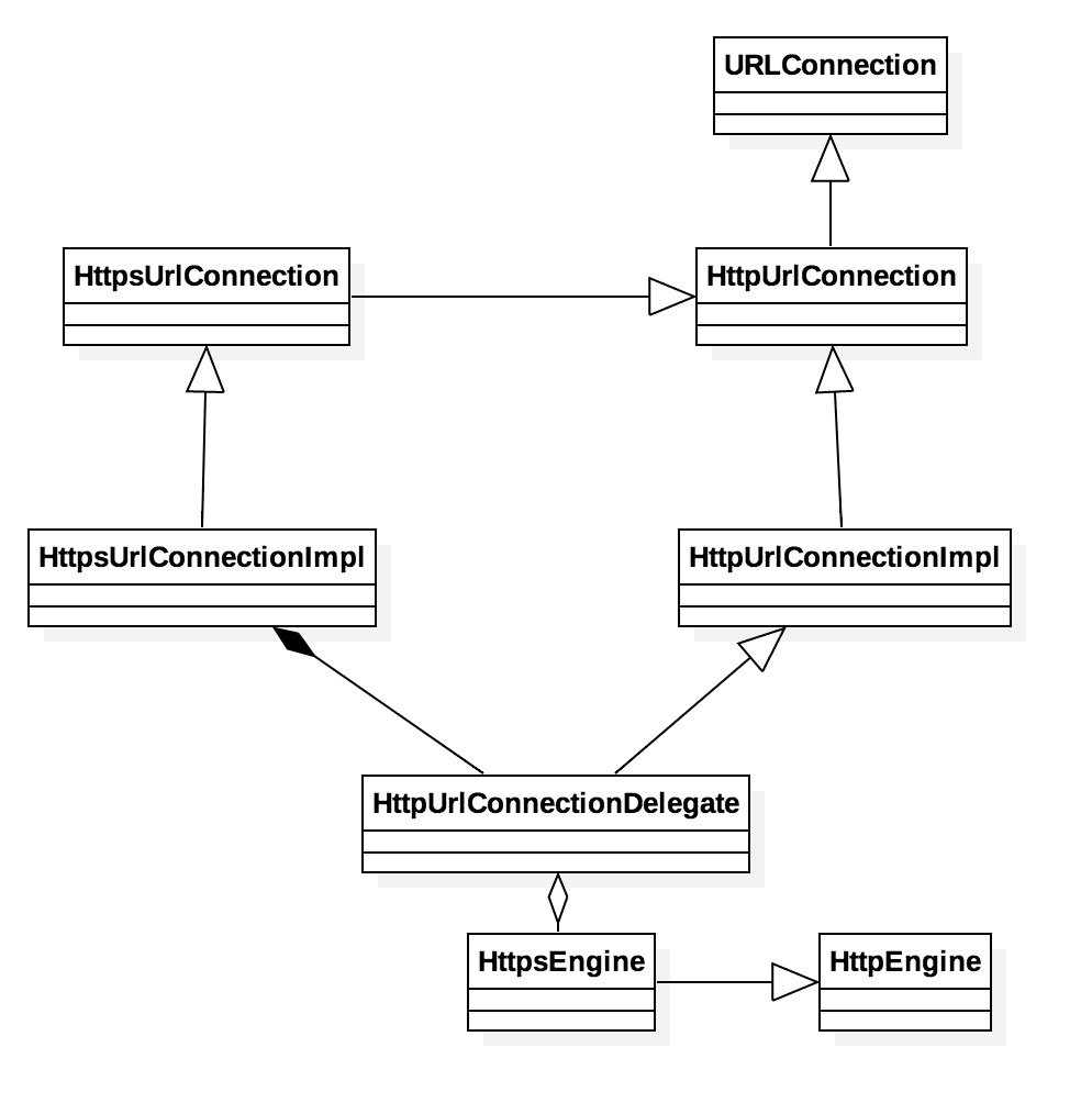 HttpsUrlConnectionImpl.jpg从类图可以看到,HttpsUrlConnectionImpl的继承树里包含了HttpUrlConnection,也就是说HttpUrlConnection中的基本功能都是共用的,可能你会觉得这是废话。而有一个关键点在于其还有一个子类HttpUrlConnectionDelegate,这个子类又继承了HttpUrlConnectionImpl,而它的继承树里也有HttpUrlConnection,看起来似乎有点乱了。其实不然,HttpsUrlConnection以及HttpUrlConnection都是抽象类,它们封装了各自协议里最基础接口以及功能。而HttpsUrlConnectionImpl及HttpUrlConnectionImpl是各自协议的具体实现者,并且在HttpsUrlConnectionImpl中的代理类HttpUrlConnectionDelegate其实就指向了HttpUrlConnectionImpl的实例对象,这也体现了Https只需要关心 TLS/SSL 层的事情就可以了,其他与Http相关的事情还是由Http们来完成即可。
