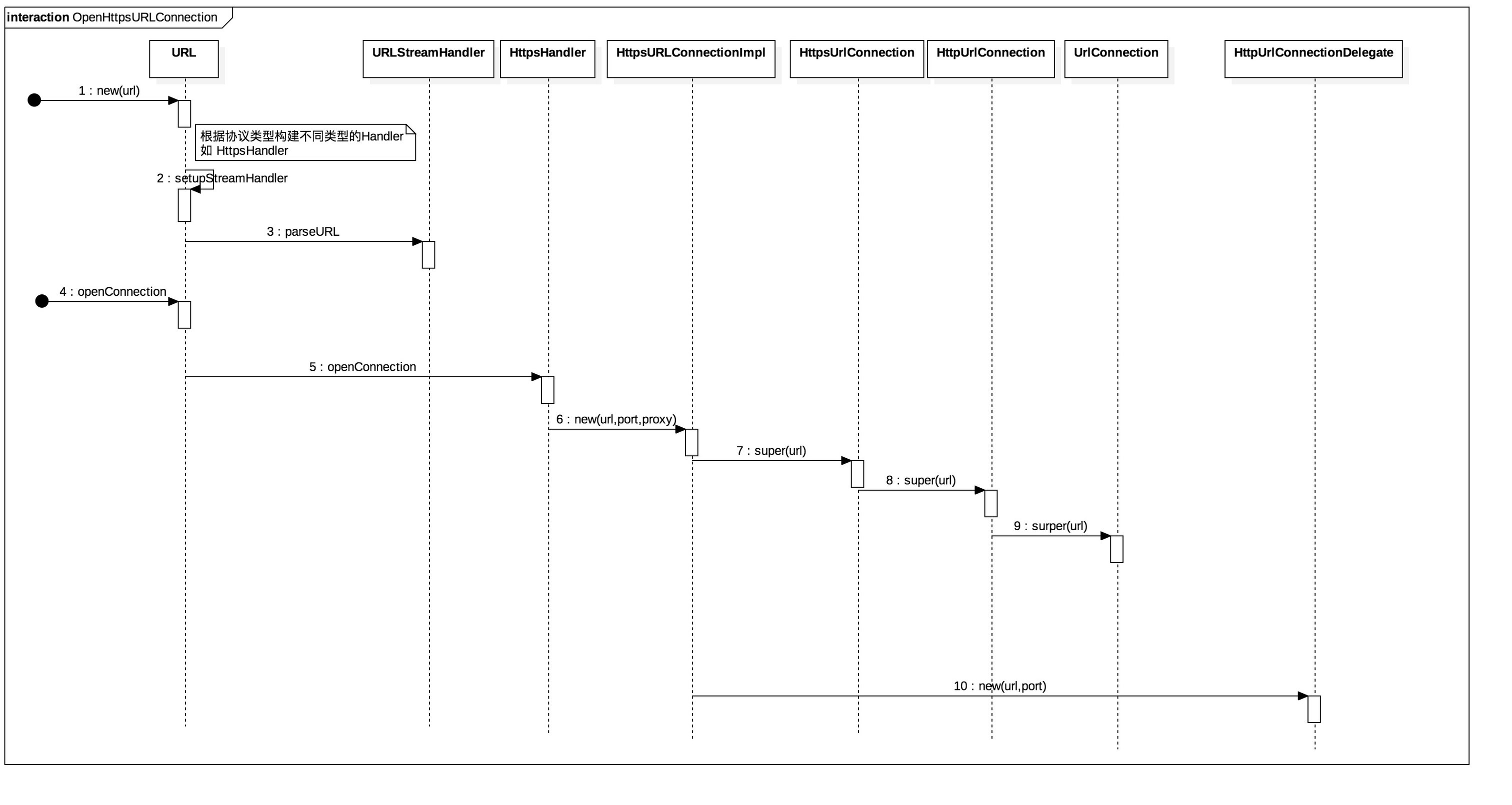 理清了Https们与Http们的关系后就可以后面的流程分析了。从时序图来看,openConnection()最终就是创建了一个HttpsUrlConnectionImpl的实现来返回给调用者。而当HttpsUrlConnectionImpl被创建时,它同时创建好HttpUrlConnectionImpl的代理类。有一点需要关注的是,系统如何判断的协议是否为Https的,看如下代码,其实很简单,在setupStreamHandler()中确定Handler的时候确定的。