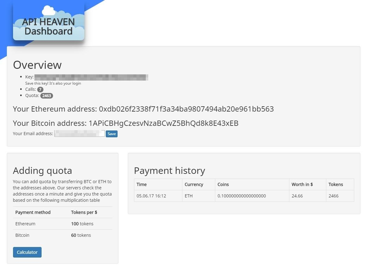 在API Heaven,我们为每位客户提供一个可以存入资金的ETH地址。cronjob每分钟检查所有客户地址以检测更改。如果他们将ETH添加到地址,则余额将转换为API配额,因此我们的客户甚至不需要登录该站点来添加资金。