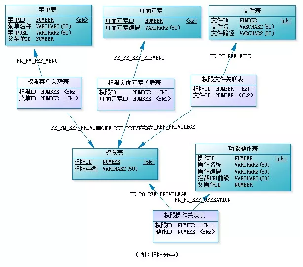 有些权限设计,会把功能操作作为一类,而把文件、菜单、页面元素等作为另一类,这样构成“用户-角色-权限-资源”的授权模型。而在做数据表建模时,可把功能操作和资源统一管理,也就是都直接与权限表进行关联,这样可能更具便捷性和易扩展性。(见下图)