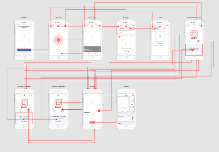 原型中有Link Page,Login Page, Home Page,Messages, Feed,Personal homepage等界面。