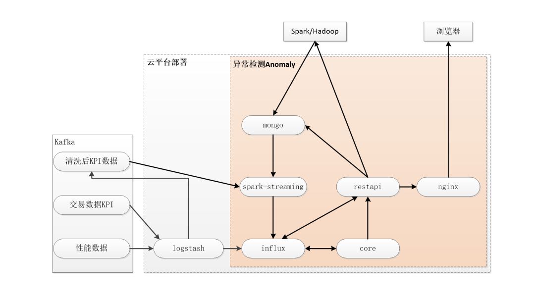 实时的异常检测:后台通过spark-streaming实时计算出结果,保存至influx中。前端浏览器通过调用api查询influx中异常结果数据。