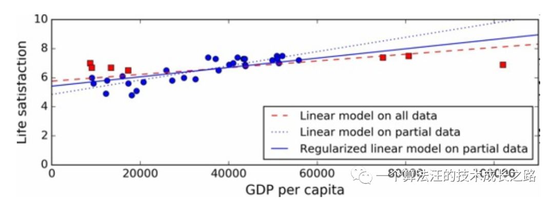 过拟合就是指算法模型在训练集上的性能非常好,但是泛化能力很差,即在测试集上的效果却很糟糕的情况。比如下图,采用一个高阶多项式回归模型来预测生活满意度和人均 GDP 的关系,很明显看出来,这个模型过拟合了训练数据,其预测效果并不会达到在训练数据上这么好的效果。
