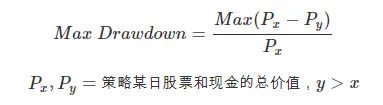 最大回撤计算公式如上,对于模型而言,最大回撤(Max Drawdown)是一个非常重要的风险指标,这个指标甚至比波动率还要重要。在回测中看到的最大回撤也在一定意义上代表你开仓后可能出现的最糟糕的状况。