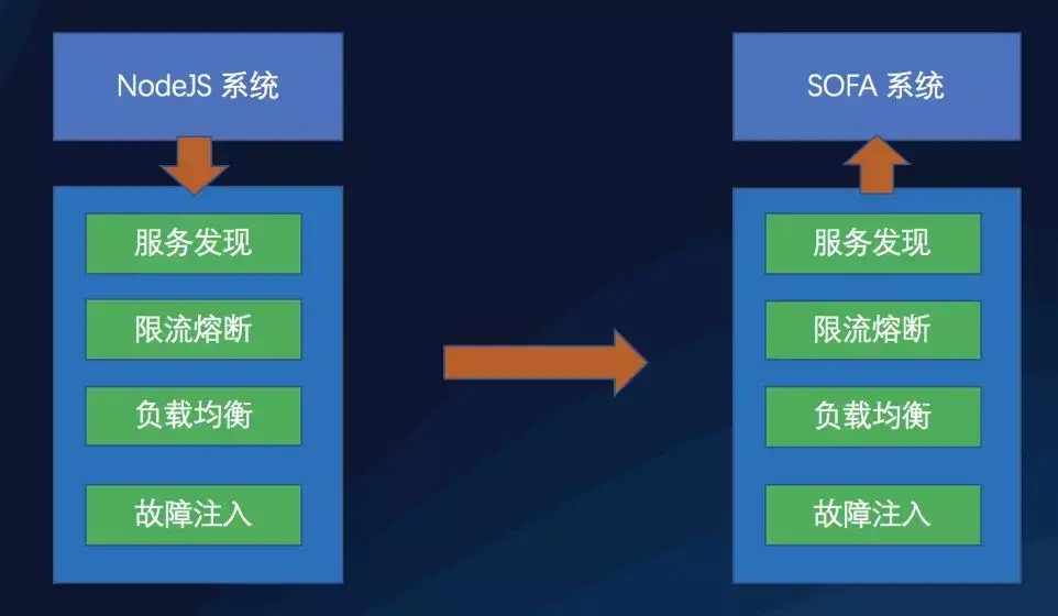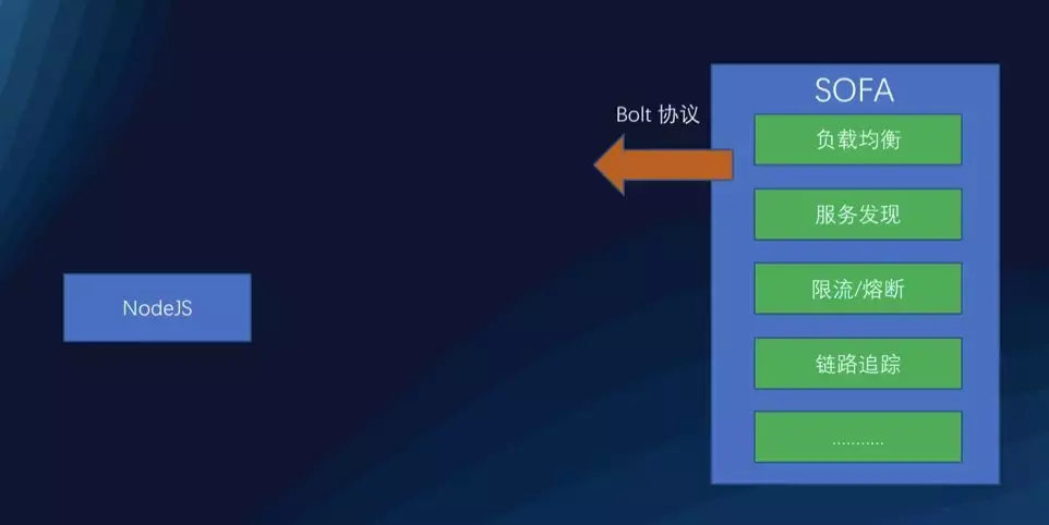 把 NodeJS 应用在核心场景下,上面提到的第一种方式当然是完全不够的,我们需要的不仅仅是一个简单的通信的方式,而是一个完整的微服务的解决方案。恰好蚂蚁的 NodeJS 团队的技术实力也非常地深厚,所以就想到了可以通过将 Java 体系中的各个微服务的组件做一个 NodeJS 的版本,比如对于通信协议 Bolt,在 NodeJS 这边,也搞了一个 sofa-bolt-node,对于 Hessian 序列化的协议,也搞了一个 NodeJS 的 Hessian 的支持 sofa-hessian-node,对于 SOFARPC,也搞了一个 sofa-rpc-node,其他的能力,比如服务发现,负载均衡,限流/熔断,链路追踪等等,都有对应的 NodeJS 的实现。