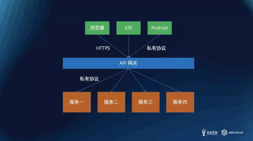 相信每个公司多多少少都有一个 API 网关,这个网关往往负责多端的接入,并且也会有多协议的支持,浏览器端可能会采用 HTTPS 来接入,iOS 和 Android 可能会采用私有的协议来对接,API 网关会将接入端的协议最终再转换成内部的协议,并且作为一个 API 网关,往往也会有鉴权,限流等等能力。