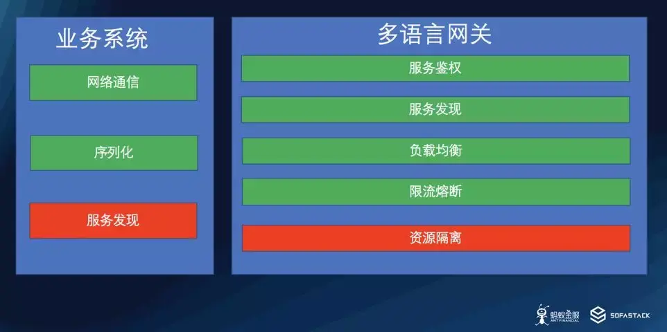 但是这种方式只能解决服务发现以及基本的通信的问题,另外的一些高阶的能力,比如熔断,限流等能力,都无法通过这种方式来解决。所以这种方式比较适合于在一些相对来说边缘的场景下去解决多语言通信问题,如果调用过程中的流量可用,不会有突发的流量,错误也是可以忍受的,那么采用这种方式可能是比较经济实惠的。这个也是蚂蚁金服早期很多多语言的场景的普遍的方式。