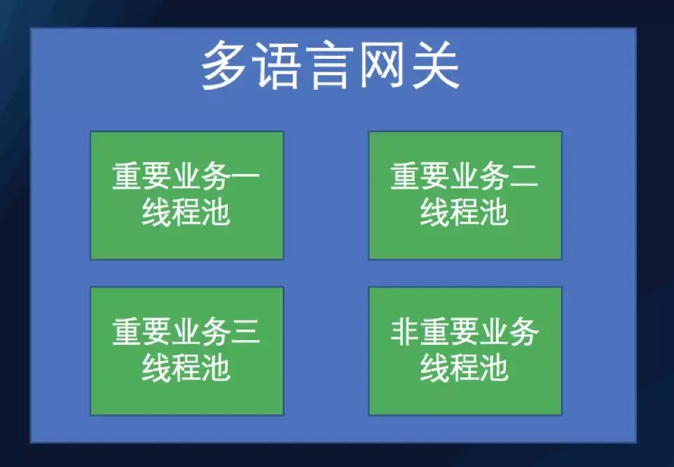 线程池隔离的方案里面仅仅做到了线程池的隔离,其他的资源的隔离其实并没有做,比如 CPU 和 Memory 之类的隔离等等,如果想要更加彻底的隔离方式,可以采用和线程池隔离类似的方式,给重要的服务用独立的多语言网关来为其服务,不重要的服务,再给一个大的独立的集群去服务。