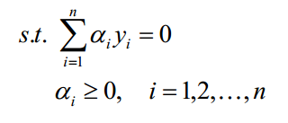 注意这里的约束条件有n+1个,之后只需要根据Data(x),Label(y)求解出满足条件的拉格朗日系数a,并将a带回求得w和b,于是就有了最后的决策边界。(w,b,x,y,a都是向量)