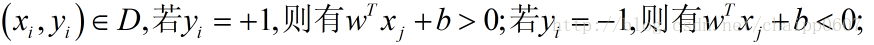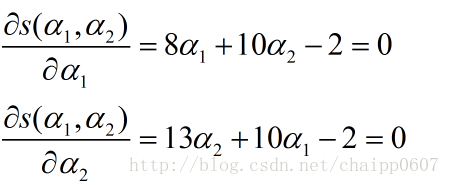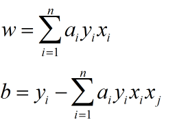 在这里对w和b的公式的推导做一个简短说明,w是通过拉格朗日求偏导后推出的;在学习SVM(二) 如何理解支持向量机的最大分类间隔中我们知道最大间隔为: