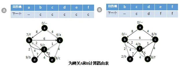 下图A部分展示了互联网中处于a的路由器的路由表的计算过程。B部分展示了处理b的路由器计算路由表的过程。注意,依据在互联网中起始位置的不同,其最短路径也不同。同样需要注意的是,在图B中是没办法到达a的,所以在该表中也没有相关条目。