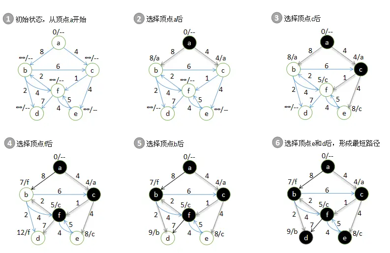 下图展示了由a到图中其他顶点的最短路径的计算过程。例如,a到b的最短路径为(a,c,f,b),其权值为7。最短路径估计和每个顶点的父结点都显示在每个顶点的旁边。最短路径估计显示在斜线的左边,父结点显示在斜线的右边。浅灰色的边是最短路径树增长过程中的边。