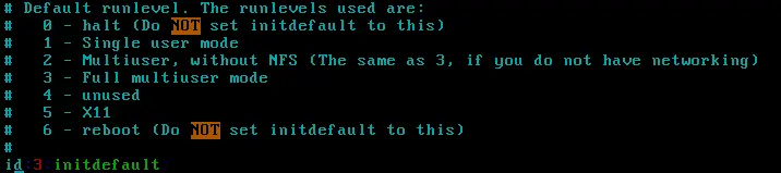 Linux系统运行级别 init juta 2018-09-06 313 阅读1分钟 runlevel 功能:查看当前系统运行级别 语法:runlevel系统运行级别说明: 0 关机 1 单用户(类似windows的安全模式) 2 不完全多用户(不包含网络服务、不含NFS(network file system)文件共享服务) 3 完全多用户(字符界面) 4 未分配 5 图形界面(X11),Xwindow 6 重启修改运行级别 注意冒号,不要误删除了,误删除会导致,可能无法开机vim /etc/inittab