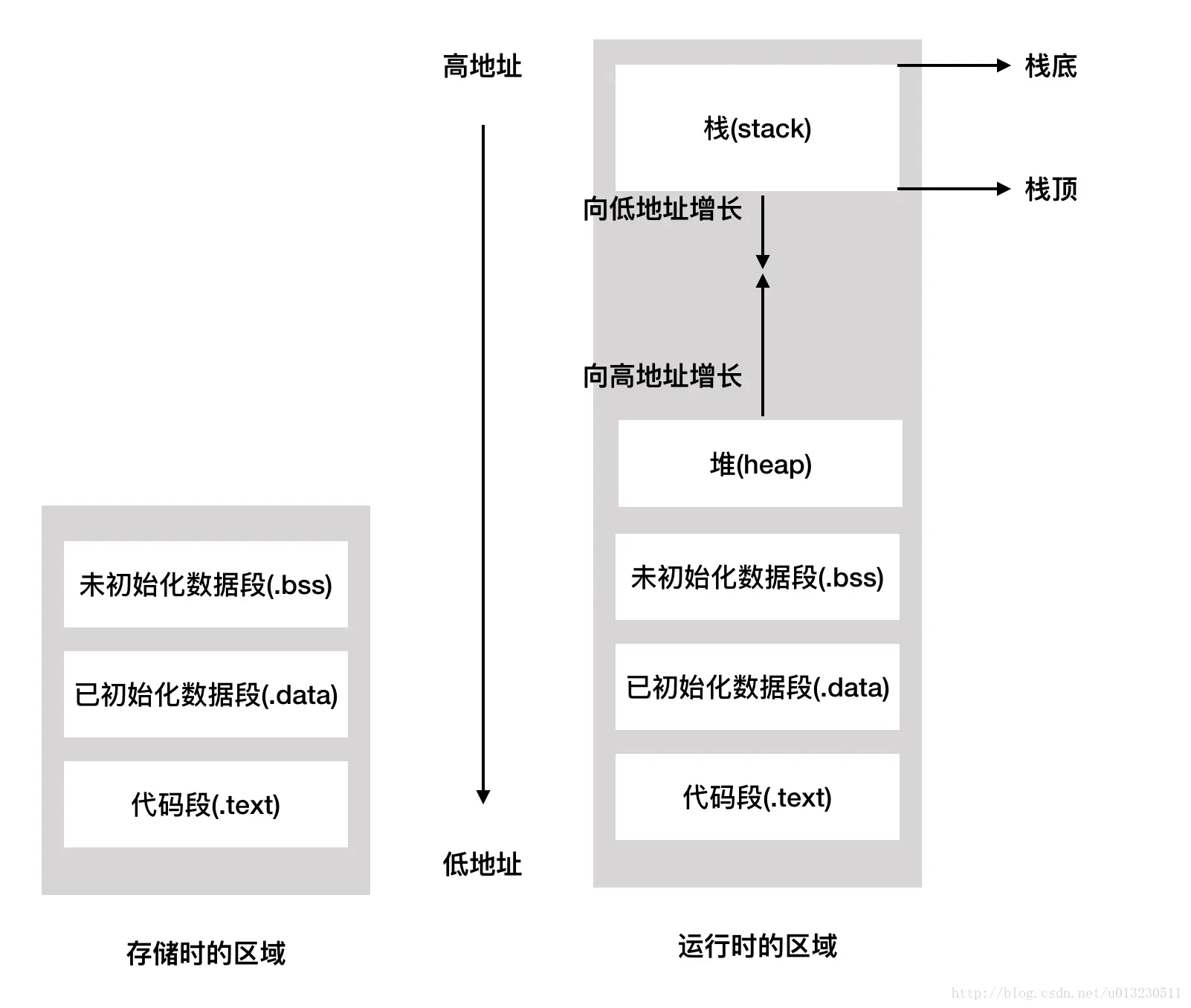 LIFO结构,从高地址向低地址生长。栈有2种分配方式:静态分配和动态分配。静态分配是编译器完成的,比如局部变量的分配。动态分配由alloca函数进行分配,但是栈的动态分配和堆是不同的,他的动态分配是由编译器进行释放,无需我们手工实现。