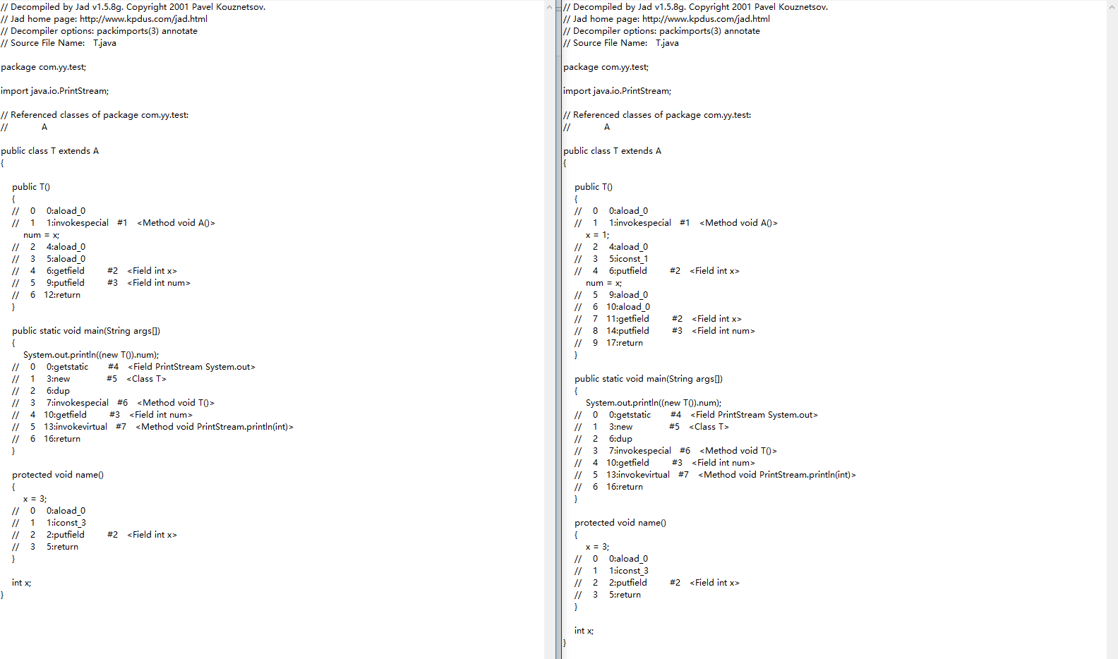 如图,左侧为x未赋值情况下反编译后的输出,右侧为x=1情况下反编译后的输出。为了方便查看,在此通过Jad进行反编译,来更加直观的表示结果。