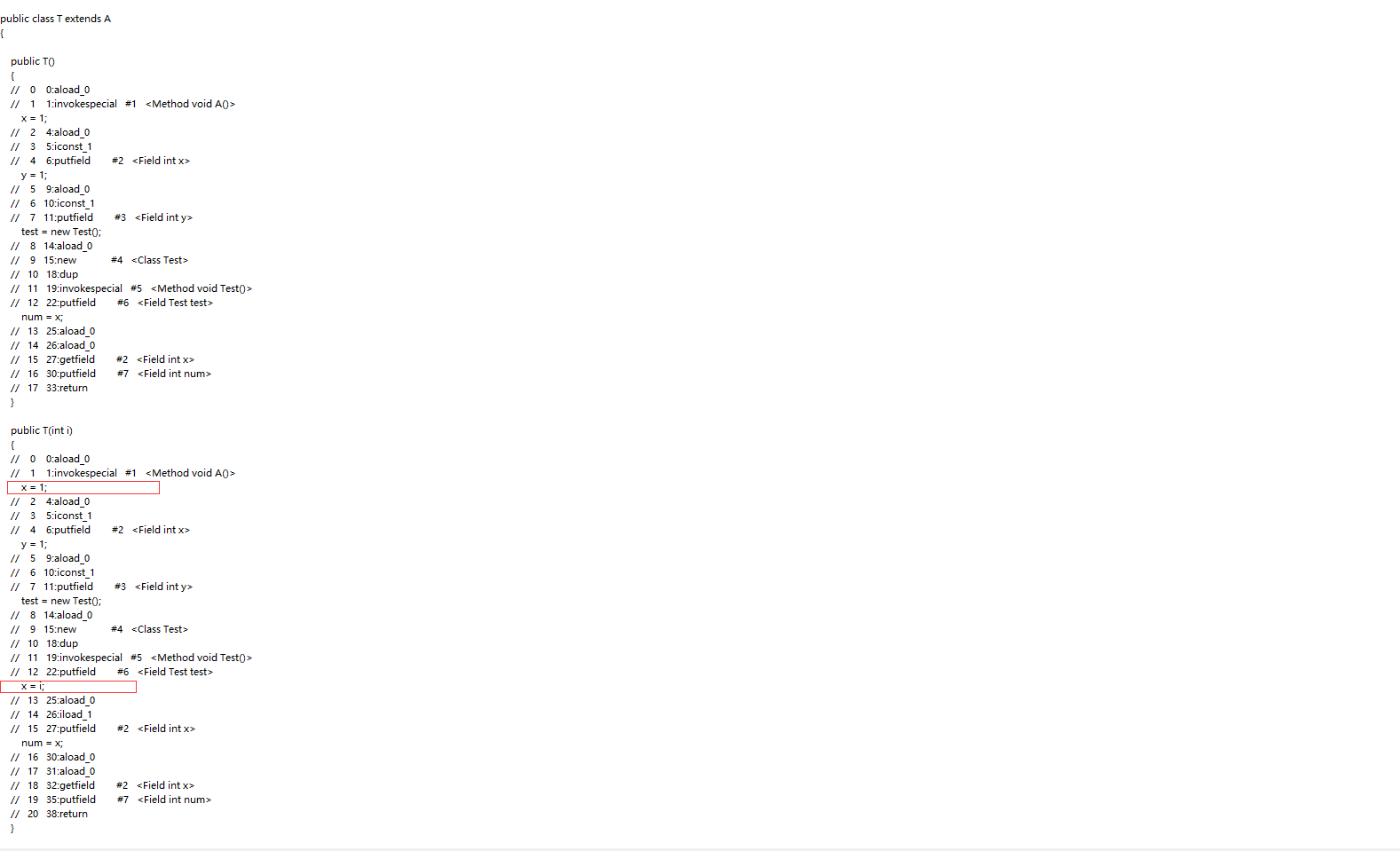因为T继承了A,所以正常情况下,创建一个新的T对象的同时,应该首先执行父类A的构造函数,再执行子类T的构造函数,所以第一种情况,代码输出为3是正常的。可是为什么x有初始值的情况下,代码输出为1呢?