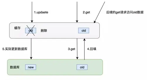 这个操作有一个比较大的问题,在对缓存删除完之后,有一个读请求,这个时候由于缓存被删除所以直接会读库,读操作的数据是老的并且会被加载进入缓存当中,后续读请求全部访问的老数据。