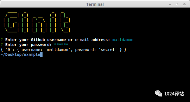 接下来我们要做的就是写个函数,提示用户输入 Github 登录凭证。这个可以用 Inquirer 来实现。这个模块包含一些支持各种提示类型的方法,语法上跟 HTML 表单控件类似。为了收集用户的 Github 用户名和密码,我们分别用了 input 和 password 类型。