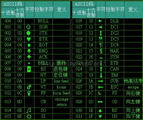 第一部分:0~31(0x00~0x1F)及127(共33个)是控制字符或通信专用字符,有些可以显示在屏幕上,有些则不能显示,但能看到其效果(如换行、退格)如下表: