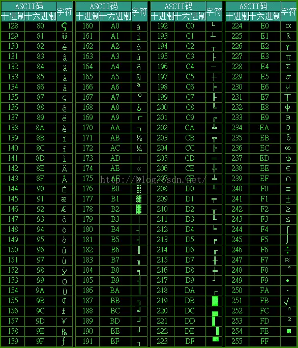 1981年IBM PC ROM256个字符的字符集,即IBM扩展字符集,这128个扩充字符是由IBM制定的,并非标准的ASCII码.这些字符是用来表示框线、音标和其它欧洲非英语系的字母。如下图: