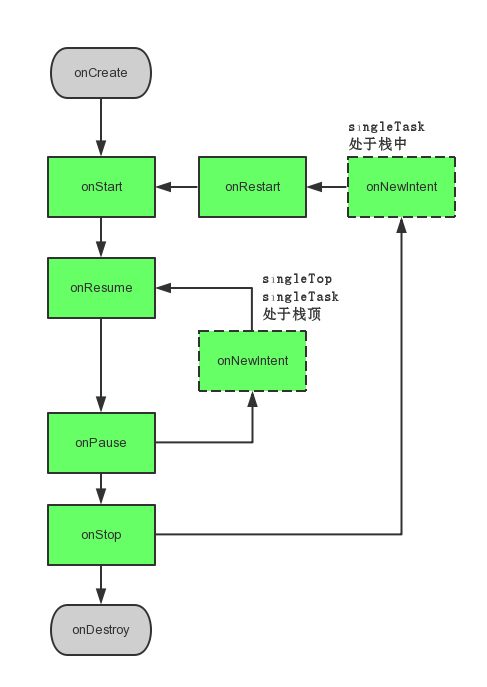 当 activity (假设为 A) 的 launchMode 为 singleTop 且 A 的实例已经在 task 栈顶,或者 launchMode 为 singleTask 且 A 的实例已在 task 栈里 (无论是栈顶还是栈中),再次启动 activity A 时,便不会调用 onCreate() 去产生新的实例,而是调用 onNewIntent() 并重用 task 栈里的 A 实例。