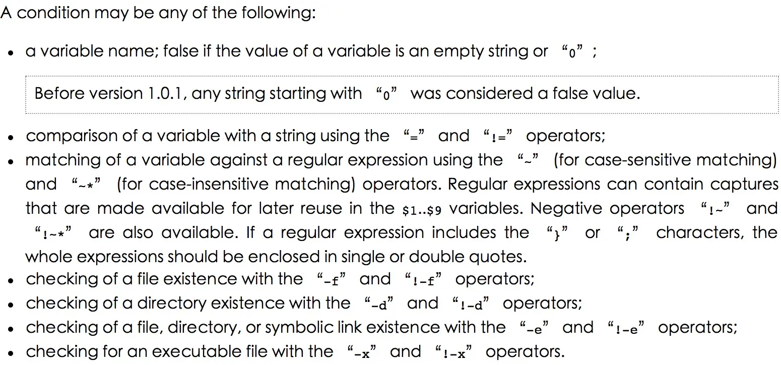 上述方式虽然不需要额外开发,性能方面也接近原生的Nginx框架,但是使用场景比较受限,因为if指令仅支持比较简单的condition类型,官方描述如下: