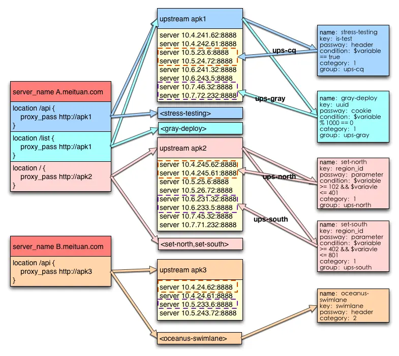 Oceanus是美团基础架构部研发的统一HTTP服务治理框架,基于Nginx和ngx_lua扩展,主要提供服务注册与发现、动态负载均衡、可视化管理、定制化路由、安全反扒、session ID复用、熔断降级、一键截流和性能统计等功能。本文主要讲述Oceanus如何通过策略抽象、查询、渲染和分组动态更新,实现HTTP请求的定制化路由。 随着公司业务的高速发展,路由场景也越来越复杂。比如: