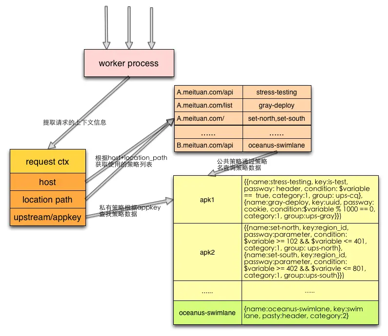 - 如果是私有策略,从request上下文获取Location关联的Upstream,即应用标识appkey,到共享内存读缓存区获取具体的策略数据。