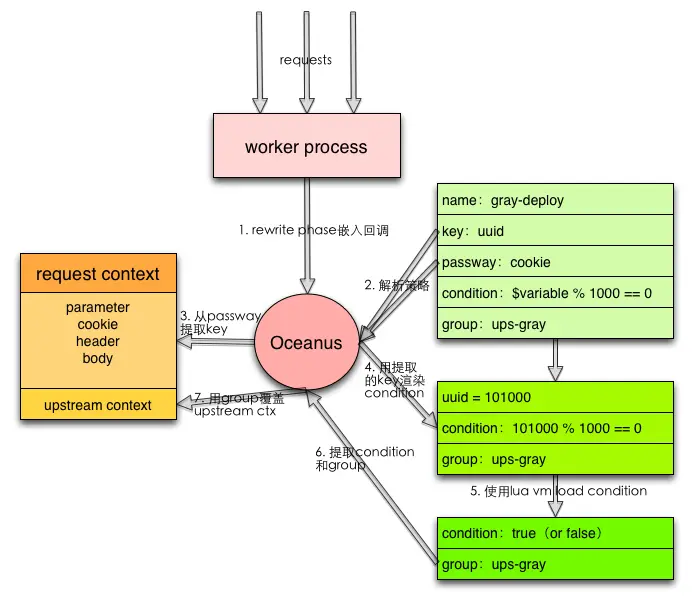 - 在rewrite phase,Oceanus通过rewrite_by_lua_file嵌入回调,触发请求处理,进入分流框架的主流程。