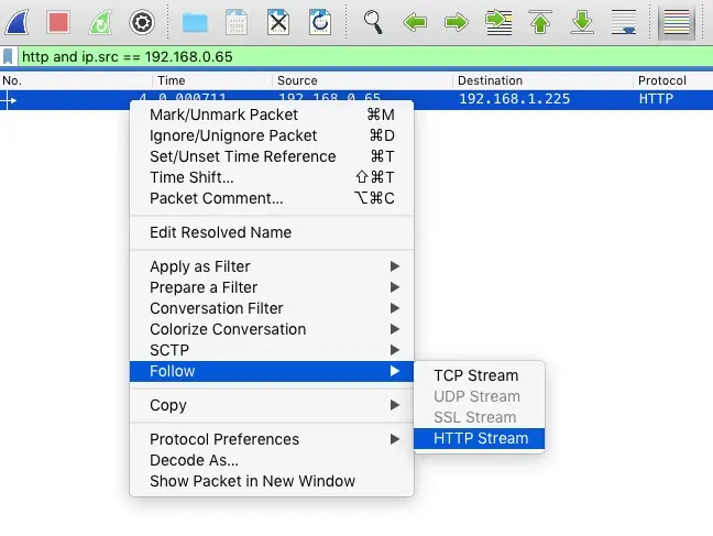找到我们需要分析的http请求了,那么怎么查看请求响应的内容呢?也很简单,只需要选中这个请求,右键 Follow - HTTP Stream: