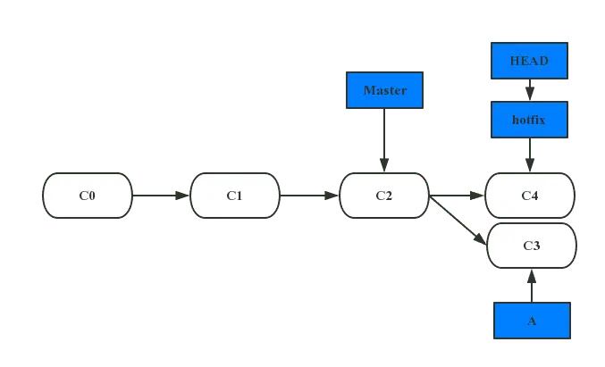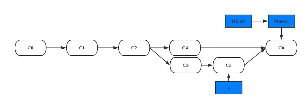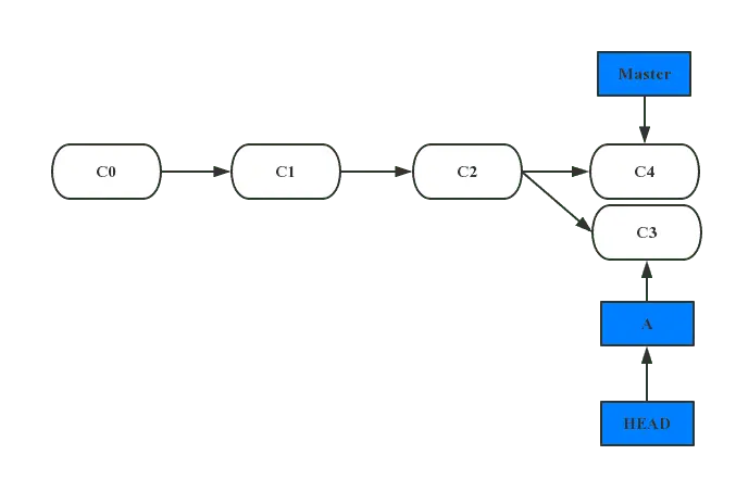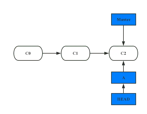 其中C0、C1、C2为提交的对象。现在你要开发一个代号为A的新需求,那么你可以新建一个分支并同时切换到那个分支上工作。那么Git又是怎么知道当前在哪一个分支上呢? 也很简单,它有一个名为HEAD的特殊指针。在