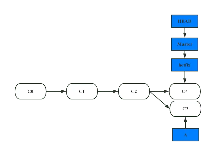 此时,在hotfix分支上所做的工作并没有包含到分支A中。 如果你需要拉取hotfix所做的修改,你可以使用git merge master命令将 master分支合并入A分支,或者你也可以等到A分支完成其使命,再将其合并回master分支。
