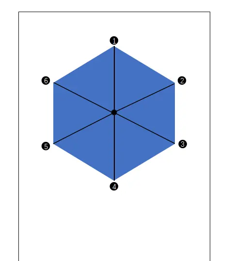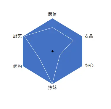 首先,这是用户对应六个属性值的等边六边形,等边六边形这是一个很关键的点;为什么是等边六边形呢,因为用户留个属性的峰值的一样的,起点也是一致的。 - 中心点