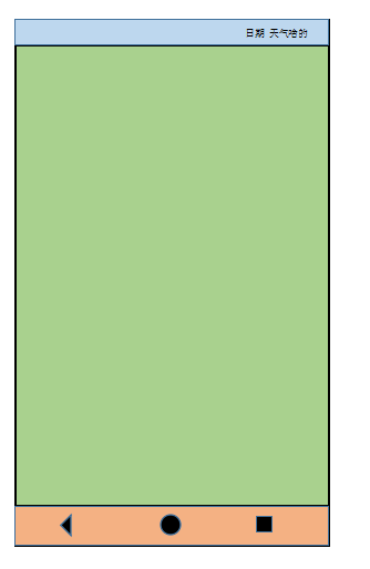 假如一个屏幕的区域是这样,蓝色的那条叫状态栏(statusBar),下面橙色的那条叫导航(NavigationBar),中间绿色的是应用区域。标题栏是应用区域里面的,因为现在很多都是用到自定义的标题栏而不是系统的标题栏,所以这里不介绍。