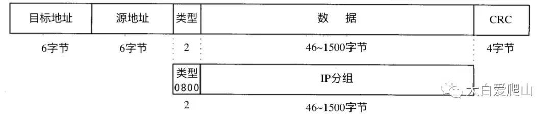 以太网帧包括48bit的目标地址和源地址,接下来是一个16bit的类型字段,它标识这个帧所携带的数据的格式。对于IP分组,类型是0x0800。帧的最后是一个32bit的CRC循环冗余检验,用于检验帧的差错。