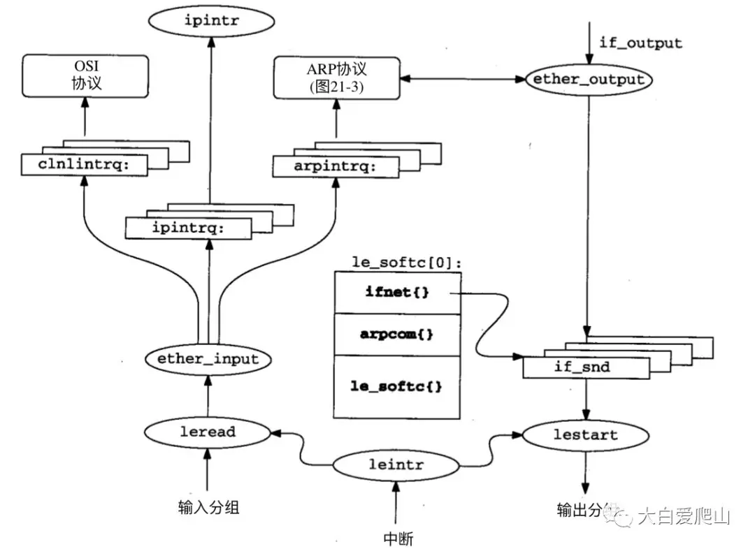 图3中,椭圆表示一个函数(leintr),方框表示一个数据结构(le_softc[0])以及用圆角方框标识一组函数(ARP协议)。