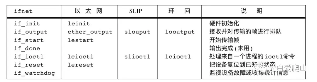 网络设备驱动程序通过ifnet结构的7个指针来访问。图1列出了指向我们三个例子驱动程序的入口点。