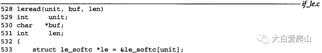 528~539 函数leintr给leread传了三个参数:unit,它表示接收到此帧的特定接口卡;buf,它指向收到的帧;len,它是帧的字节数(包括首部和CRC)。