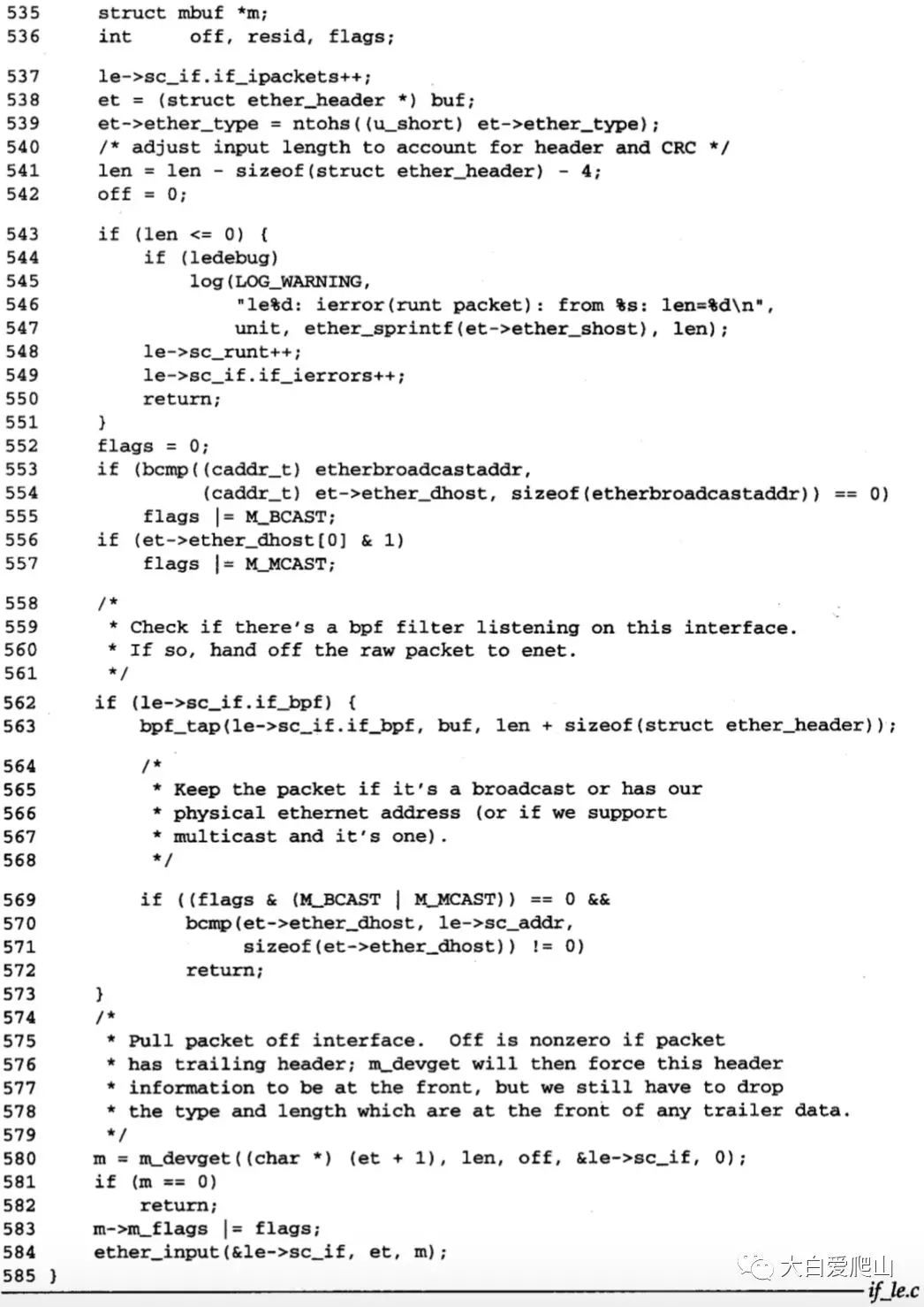 574~585 m_devget将传给leread的缓存复制到一个它分配的mbuf链中,并返回mbuf的指针。传给m_devget的第一个参数指向以太网首部后的第一个字节,它是此帧中的第一个数据字节。如果m_devget获取内存失败,leread立即返回。另外广播和多播标志被设置在链表中的第一个mbuf中,ether_input处理这个分组。